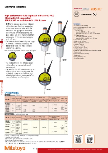High-performanceABSDigimaticIndicatorID-FNX(DigimaticS1supported)SERIES543—withBack-litLCDScreen•ID-FSeriesisanext-generationindicatorwithvariousnewfunctions,supportingbidirectionalcommunication.Withtheadditionoftheappropriatedatacableandsoftware,remotezerosettingandgagesettingcanallbeimplementedfromaconnectedPC,therebyimprovingyourworkefciency.•Thisseriesadoptsanexternalpowersupplytooperateabrightbacklitdisplay.Thedisplaycolorhelpsyoumaketolerancejudgmentataglance.GreenindicationforGOjudgmentRedindicationfor±NGjudgment543-851543-853•Thenextcalibrationduedatecanbesetwithanalarmtoimproveinstrumentmanagement.•TheABS(ABSOLUTE)scalerestoresthelastoriginposition*automaticallywhentheindicatoristurnedon,andrealizeshighreliabilitybyeliminatingover-speederrors.*Referto“Precautionsforuse”onpage07-2.Resolution0.0005mm50readings/sResolution0.001mm,0.01mm500readings/s1)Samplingrate:2)Capturingspeed:Functions•Peakdetection(MAX/MIN)•Runoutrangemeasurement(MAX-MIN)Note:PeakdetectionResolution0.0005mm50µm/sResolution0.001mm,0.01mm500µm/s•Zero-setting(INCsystem)•Presetting(ABSsystem)•Measuringdirectionswitching•Tolerancejudgment•Resolutionswitching•Simplecalculationf(x)=Ax•Analogresolutionselection•Datahold(whennotconnectedtoanexternaldevice)•FunctionLock•Calibrationschedulewarning•Dataoutput•Displayrotation(330°)•ErroralarmdisplaySPECIFICATIONSMetricISO/JISType543-855CodeNo.*3Range(mm)Resolution(mm)Maximumpermissibleerror(MPE)*1(mm)PartialmeasuringrangePMPETotalmeasuringrangeEMPEHysteresisRepeatabilityHMPERMPEMaximumpermissiblelimit(MPL)Measuringforce(N)PowersourceMass(g)543-855543-855B(atback)543-851543-853543-85712.725.450.80.0005/0.001/0.01(selectable)0.00250.00250.0040.0030.0040.003Inch/MetricASME/ANSI/AGDType0.0020.0021.5orless1.8orless2.3orlessCodeNo.*3RangeResolution543-856543-856B(atback)543-852543-854543-8580.5in/12.7mm1in/25.4mm2in/50.8mm0.00002/0.00005/0.0001/0.0005/0.001in,0.005/0.001/0.01mm(selectable)Maximumpermissibleerror(MPE)*1(in)Overall*2HysteresisRepeatability±0.00010±0.00016±0.000120.000080.00008Maximumpermissiblelimit(MPL)Measuringforce(N)1.5orless1.8orless2.3orlessACadapter(5.9V)180170240330PowersourceMass(g)200170240330ACadapter(5.9V)•Display:7-digitdisplay,sign,andanalogbarwith2-colorbacklight•Responsespeed:Unlimited*1Thesevaluesapplytonormalmeasurementsat20°C.*2Overallmagnicationandlinearity*3TodenoteyourACpowercableaddthefollowingsufxestothecodeNo.:AforUL/CSAandPSE,DforCEE,DCforCCC,EforBS,KforKC,NosufxisrequiredforJIS/100V.ProductcatalogE12049Video07-3