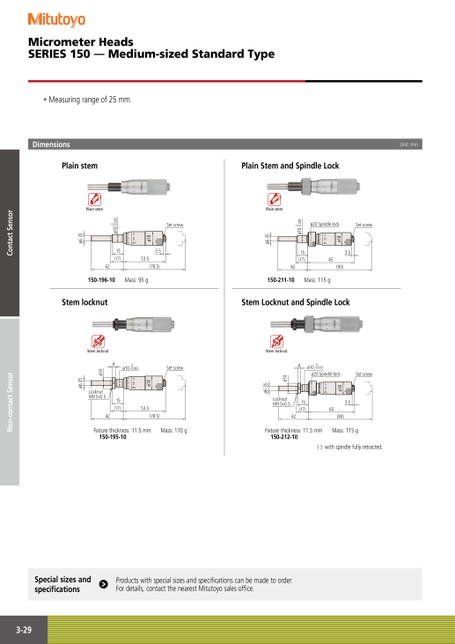 MicrometerHeadsSERIES150̶Medium-sizedStandardType•Measuringrangeof25mm.DimensionsPlainstemPlainStemandSpindleLockUnit:mmø20SpindlelockSetscrew3.565(90)ø185045-0.0090ø1015(17)42Plainstemø6.35Setscrew53.53.5(78.5)ø185045-0.0090ø1015(17)42Plainstemø6.35150-196-10Mass:95g150-211-10Mass:115gStemlocknutStemLocknutandSpindleLock4ø100-0.009ø20SpindlelockSetscrewStemlocknutø14ø6.353.565(90)ø185045LocknutM9.5×0.515(17)42Fixturethickness:11.5mmMass:115g150-212-10():withspindlefullyretracted.4ø100-0.009Setscrewø18504515(17)53.5(78.5)42Stemlocknutø14LocknutM9.5×0.5ø6.35Fixturethickness:11.5mmMass:110g150-195-10SpecialsizesandspecificationsProductswithspecialsizesandspecificationscanbemadetoorder.Fordetails,contactthenearestMitutoyosalesoffice.3-29