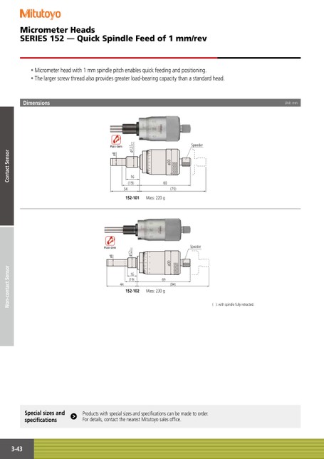 ():withspindlefullyretracted.SpeederSpeederø3060(75)20100102016(19)34-0.011ø120Plainstemø8152-101Mass:220gø3069(94)20010100010902080-0011ø12016(19)44Plainstemø8152-102Mass:230gMicrometerHeadsSERIES152̶QuickSpindleFeedof1mm/rev•Micrometerheadwith1mmspindlepitchenablesquickfeedingandpositioning.•Thelargerscrewthreadalsoprovidesgreaterload-bearingcapacitythanastandardhead.DimensionsUnit:mmSpecialsizesandspecificationsProductswithspecialsizesandspecificationscanbemadetoorder.Fordetails,contactthenearestMitutoyosalesoffice.3-43
