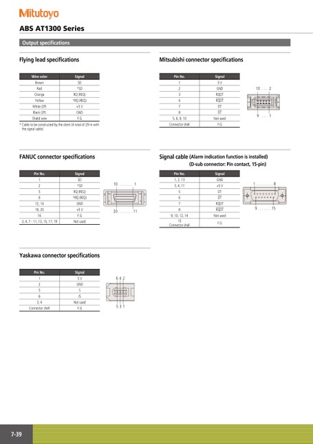 ABSAT1300SeriesOutputspecificationsFlyingleadspecificationsMitsubishiconnectorspecificationsWirecolorBrownRedOrangeYellowWhite(2P)Black(2P)ShieldwireSignalSD*SDRQ(REQ)*RQ(REQ)+5VGNDF.G*Cabletobeconstructedbytheclient(Atotalof29mwiththesignalcable).FANUCconnectorspecificationsPinNo.125612,1418,2016SignalSD*SDRQ(REQ)*RQ(REQ)GND+5VF.G3,4,7-11,13,15,17,19NotusedPinNo.1234785,6,9,10ConnectorshellSignal5VGNDRQDTRQDTDTDTNotusedF.G10...29...110........120........11Signalcable(Alarmindicationfunctionisinstalled)(D-subconnector:Pincontact,15-pin)PinNo.1,2,133,4,1156789,10,12,1415ConnectorshellSignalGND+5VDTDTRQDTRQDTNotusedF.G1.........89.......15YaskawaconnectorspecificationsPinNo.12563,4ConnectorshellSignal5VGNDS/SNotusedF.G6425317-39